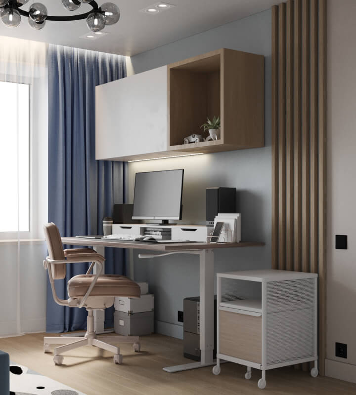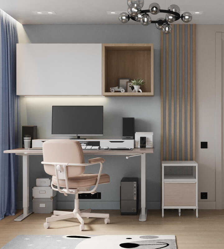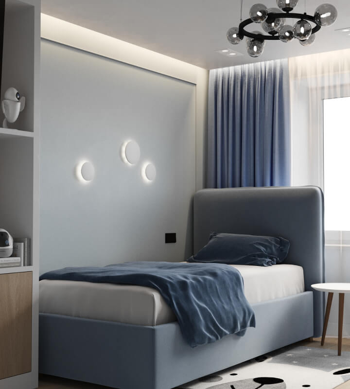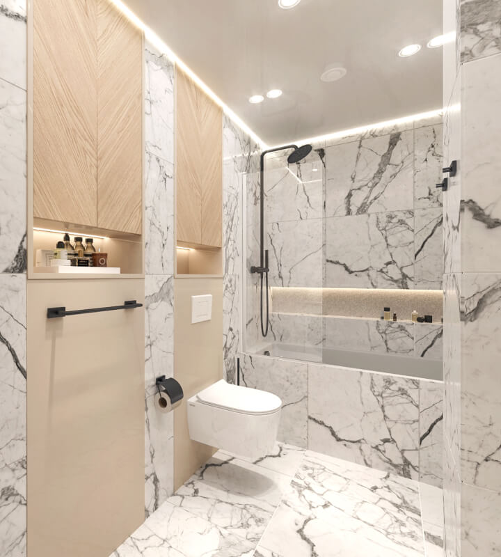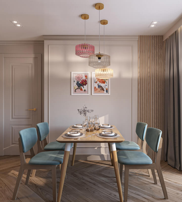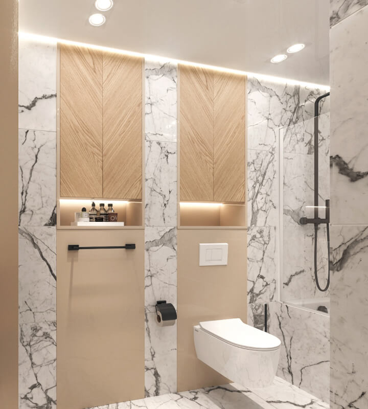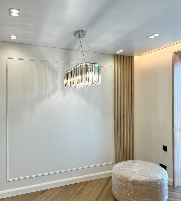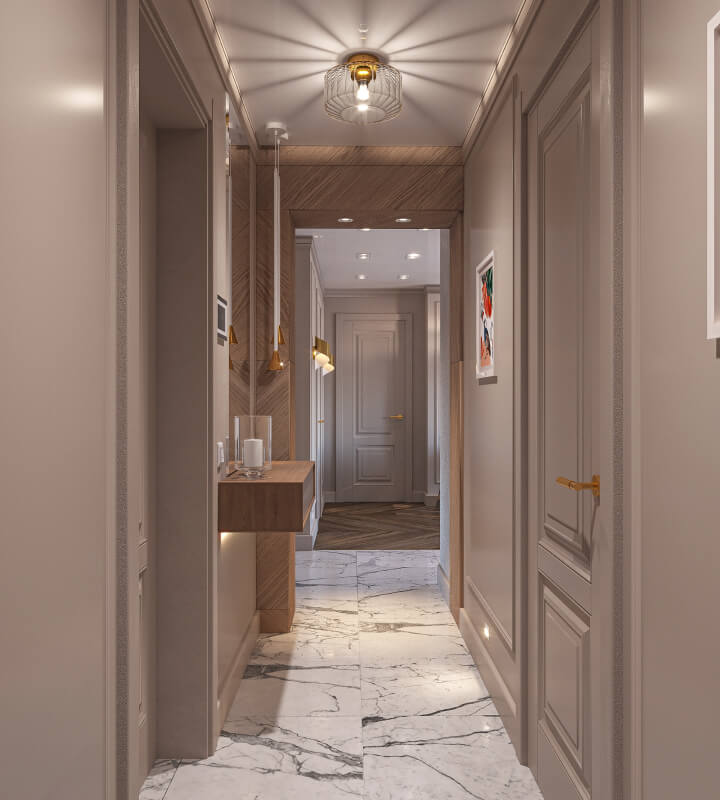 Проект квартиры для молодой семьи с маленьким ребенком, выполненный в стиле современной классики. Нежные цветовые сочетания стен, керамогранита и текстур дерева сделали интерьер очень уютным. Акцентные светильники добавили интерьеру выразительности.
