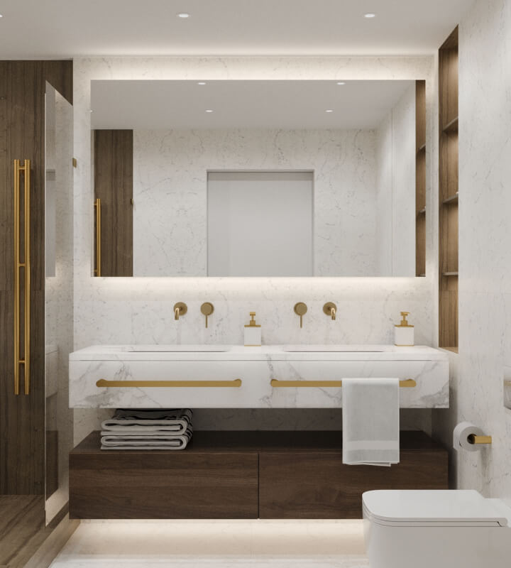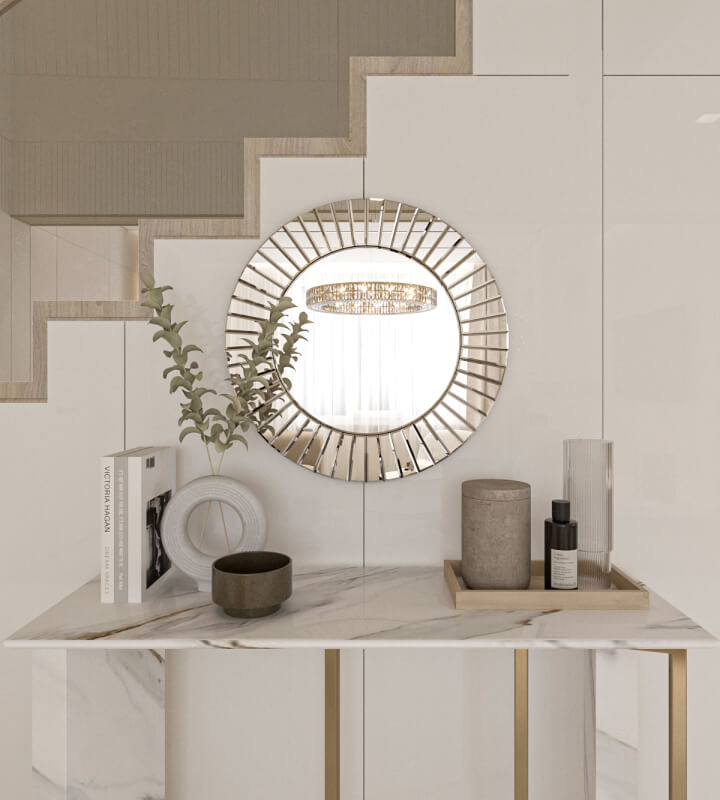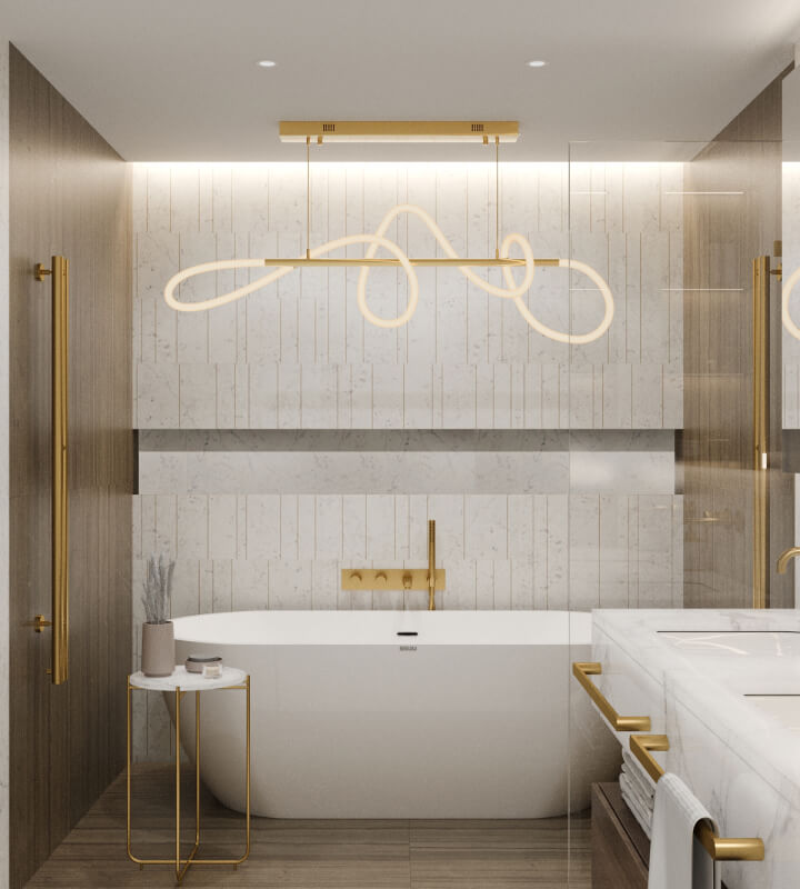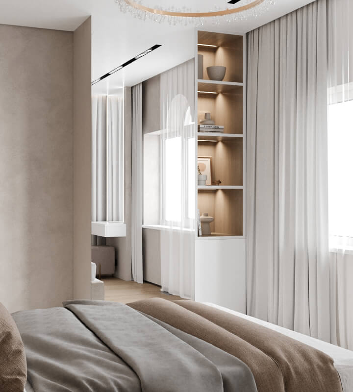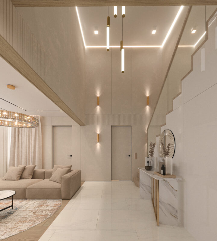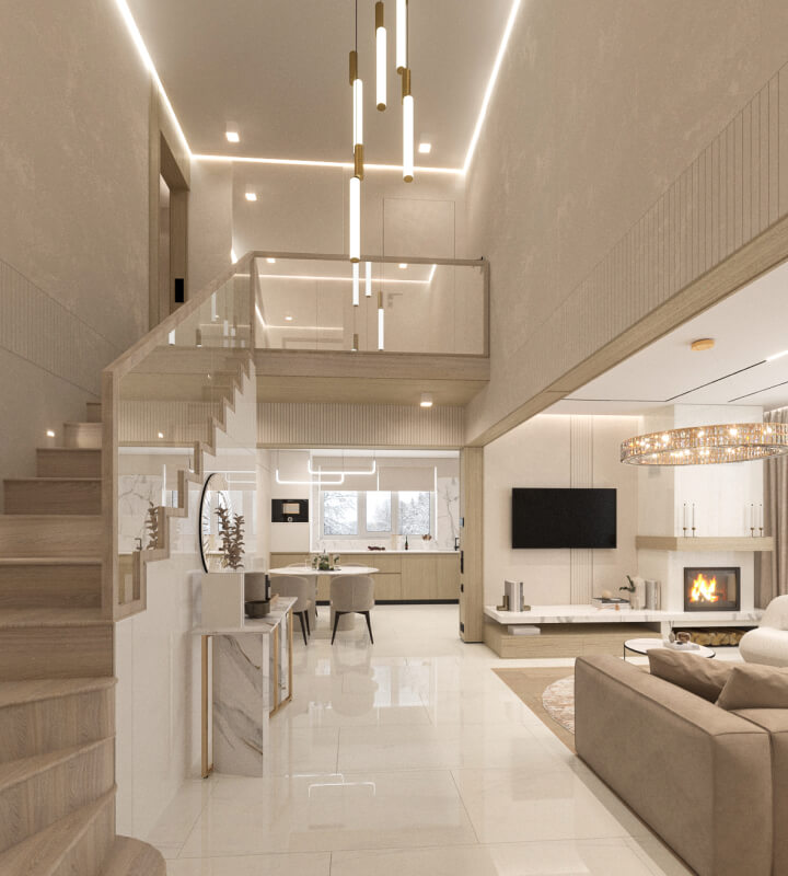Здесь было важно все: экологичные материалы, интересные аксессуары, практичность в интерьере. Основной акцент интерьера — зона гостиной со вторым светом и коридором второго этажа. Данная зона имеет большое количество освещения, спроектированного для разных сценариев. Стеклянное ограждение лестницы придает данному элементу легкость и воздушность. Под лестницей также предусмотрено долгосрочное хранение.
