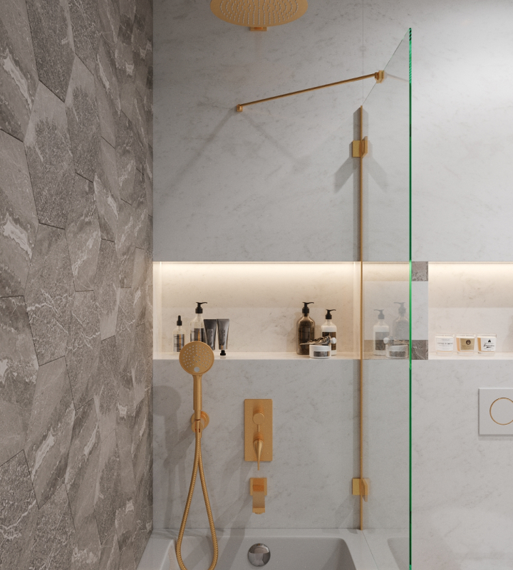 В отделке квартиры использованы золотые акценты и текстура мрамора. А наличие натурального дуба добавляют тепла и природной красоты в интерьер, создавая гармоничное сочетание с общей атмосферой.