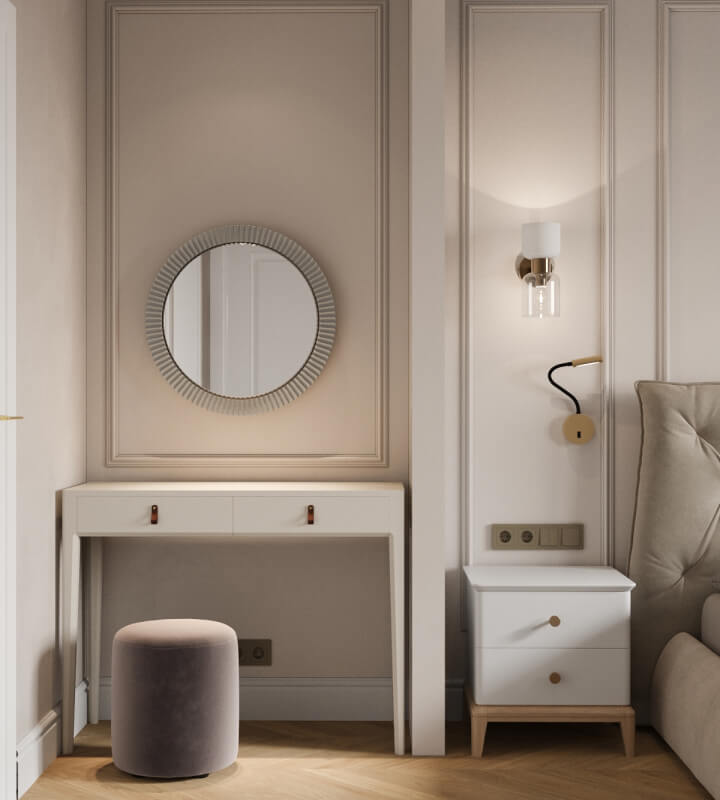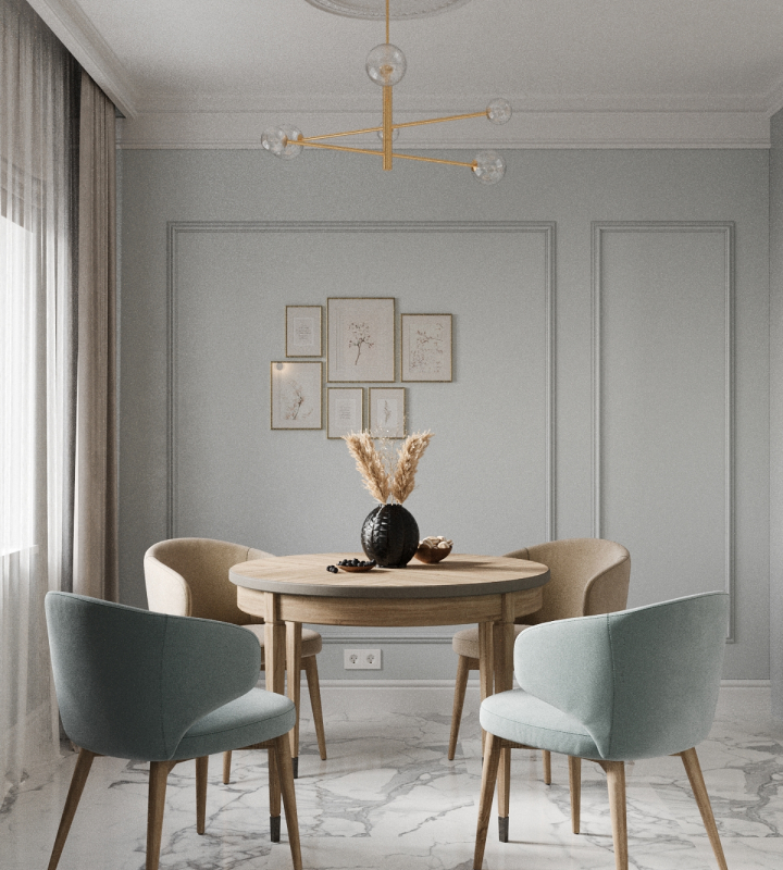 Вдохновленный стилем «Современная классика», этот интерьер олицетворяет элегантность и изысканность. Одной из главных целей проекта было создание спокойного и уютного пространства, которое было бы истинным убежищем от городской суеты. Обилие настенных молдингов, потолочных карнизов и розеток добавляет роскоши и утонченности пространству квартиры.